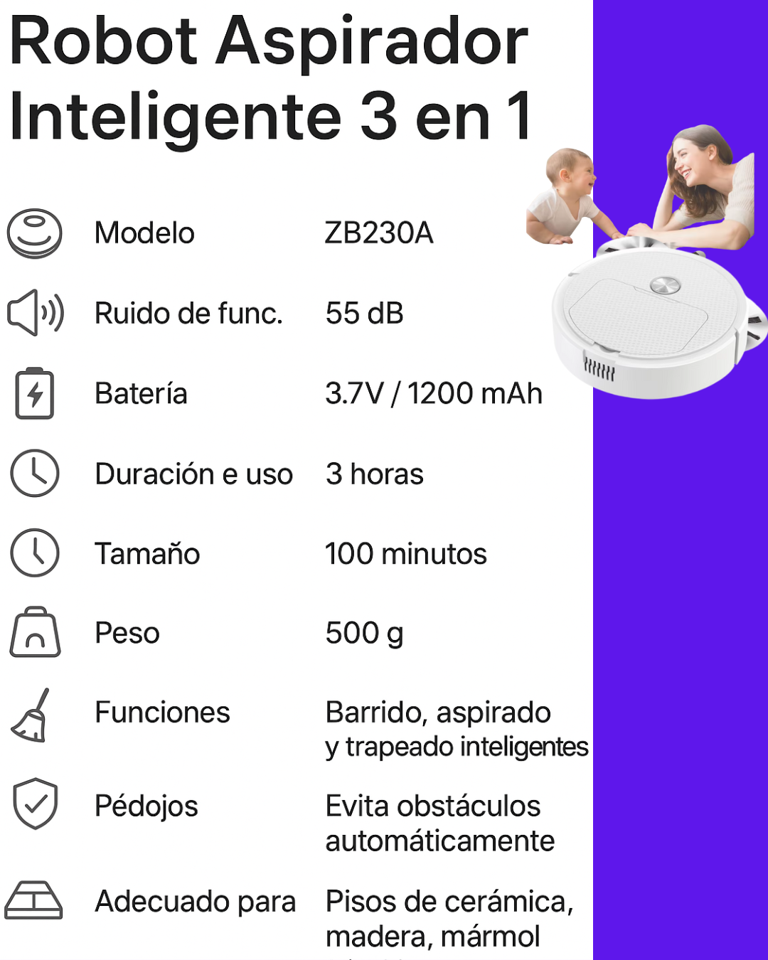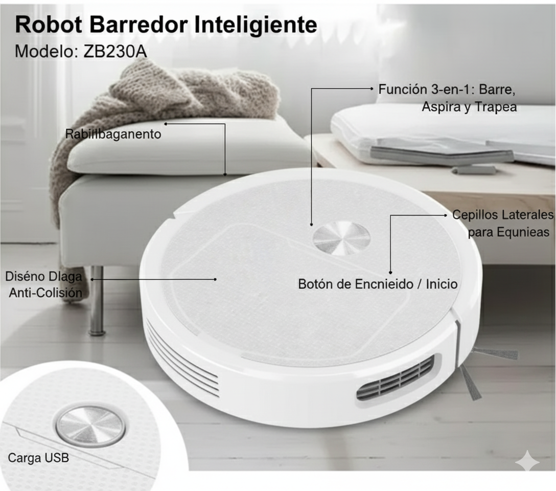 El Robot Aspiradora ZB230A™ tiene succión turbo de 3000 Pa, ideal para polvo, migas, pelos de mascotas y hasta arena fina. Además, trapea con agua para dejar el piso reluciente.